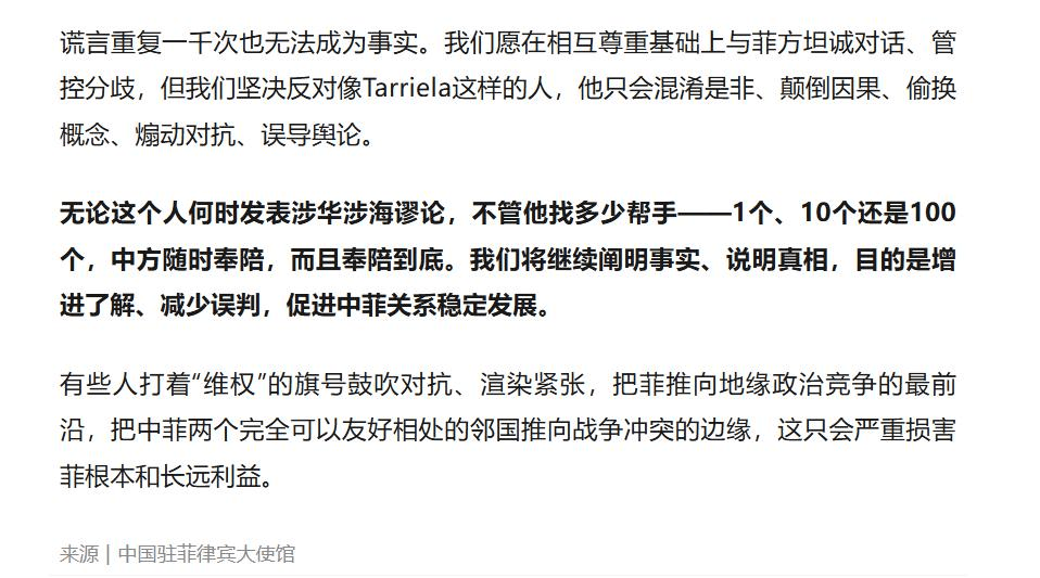 中方的严正回应可谓是信心满满,显然对于菲律宾近来的各种挑衅已忍无可忍。中国驻菲使馆的副发言人在声明中表示,“无论这些人找多少帮手,10个还是100个,中方都随时奉陪,而且奉陪到底!”这不仅是对菲律宾的一次“软威胁”,更是一种战斗姿态,表明了中国在维护国家领土完整和海洋权益方面不会妥协的决心。